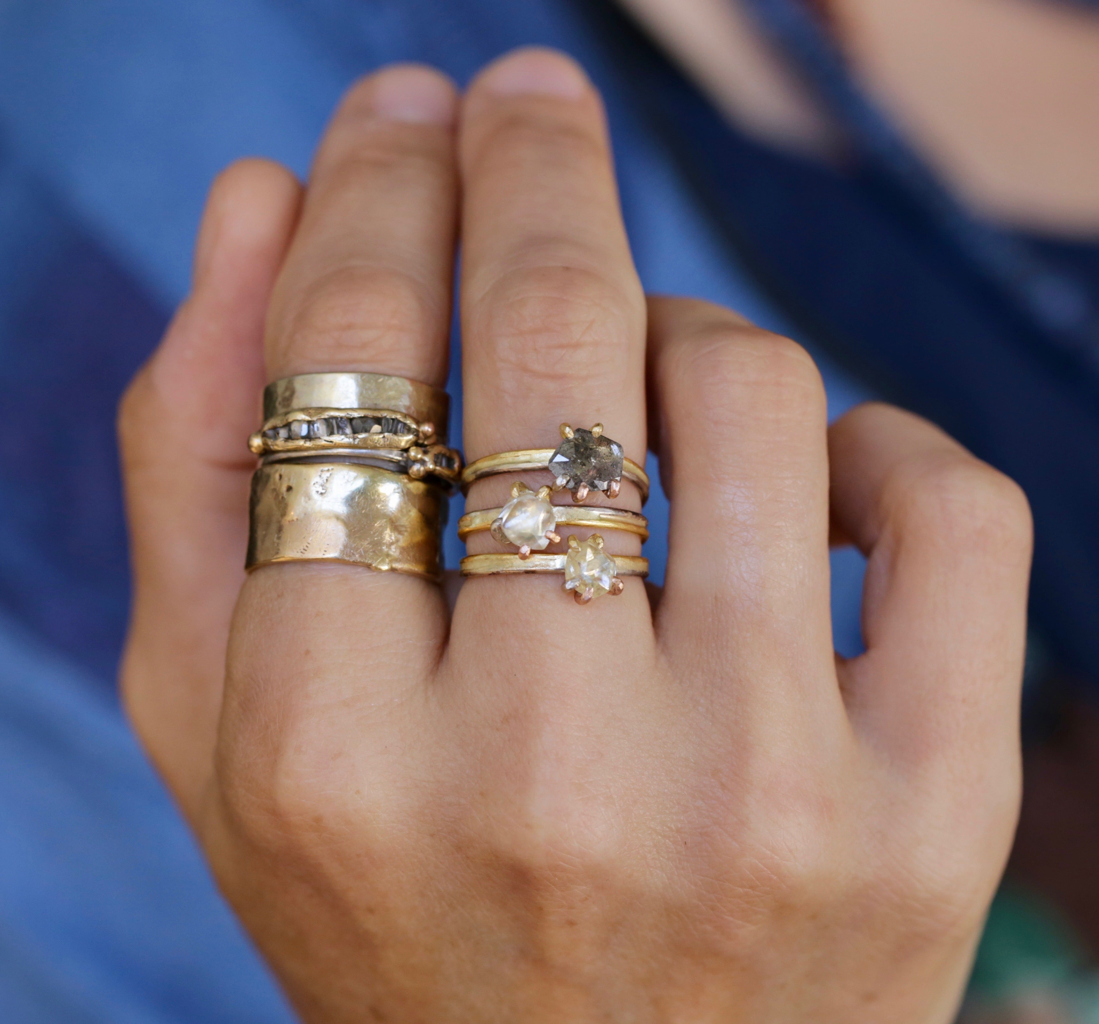 Our mixed precious metal bands are handmade in our Santa Cruz studio. We blend different colors and karat weights of gold to create beautiful patterns and textures. We work with solid gold, oxidized sterling silver and gold, and palladium and gold.